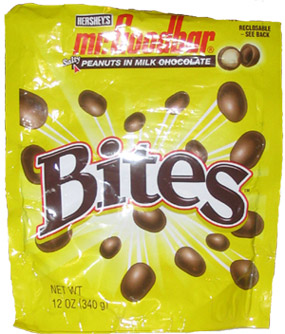 sitting. DOWNSIDE: I want to eat a bag of chocolate-covered peanuts all in one sitting. Hell, the movie I bought them for was two hours long. I stopped eating these after the previews... Also, why the whole "reclosable" bag thing - using a sticky tab you peel off the back to seal the folded bag shut for freshness. I tried using it, but the stickiness of the tab wasn't holding up to the pressure. This movie lets out and as folks are clammering for the exit, I'm wrestling with a freakin' bag of Mr. Goodbar Bites. I looked like a third grader trying to seal a jar of pickles using oven mitts dipped in petroleum jelly. |